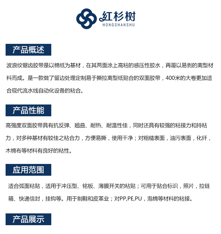 - 波浪紋鋸齒膠帶是以棉紙為基材,在其兩面涂上高粘的感壓性膠水,再覆以易剝的離型材料而成。是一款做了留邊處理定制易于撕拉離型紙貼合的雙面膠帶,400米的大卷更加適合現(xiàn)代流水線自動化設備的粘合。